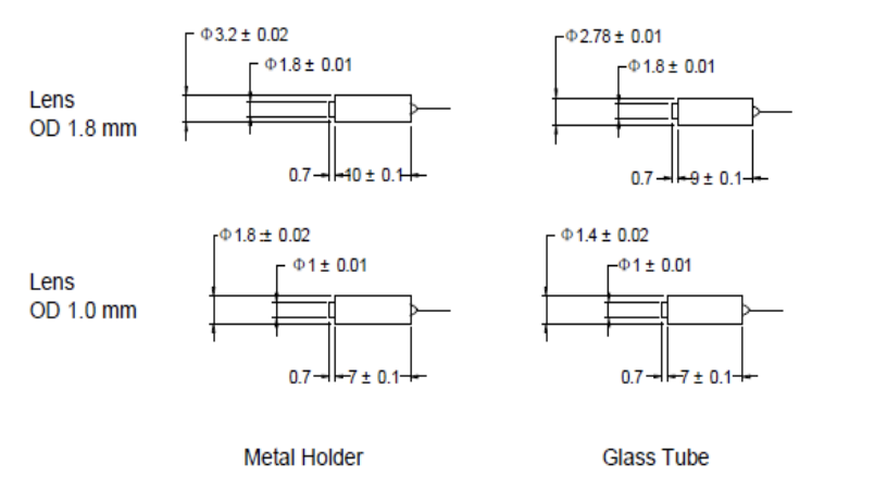 | Dimension (mm) | 1.8(OD) Lens | 3.2x10 Metal holder or 2.78x9.0 Glass tube | |||