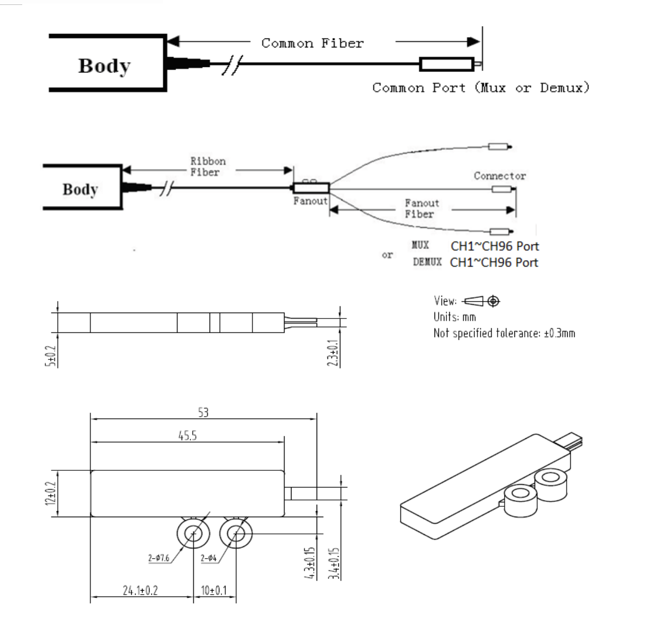 | Pigtail Type @ ITU Channel Port | SMF-28e, 4×12 ribbon 0.5+/-0.05m, fanout 900μm 0.5+/-0.05m | |